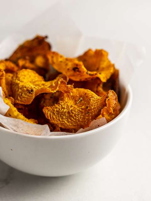 Slice the peeled rutabaga into thin chips with a mandoline slicer.