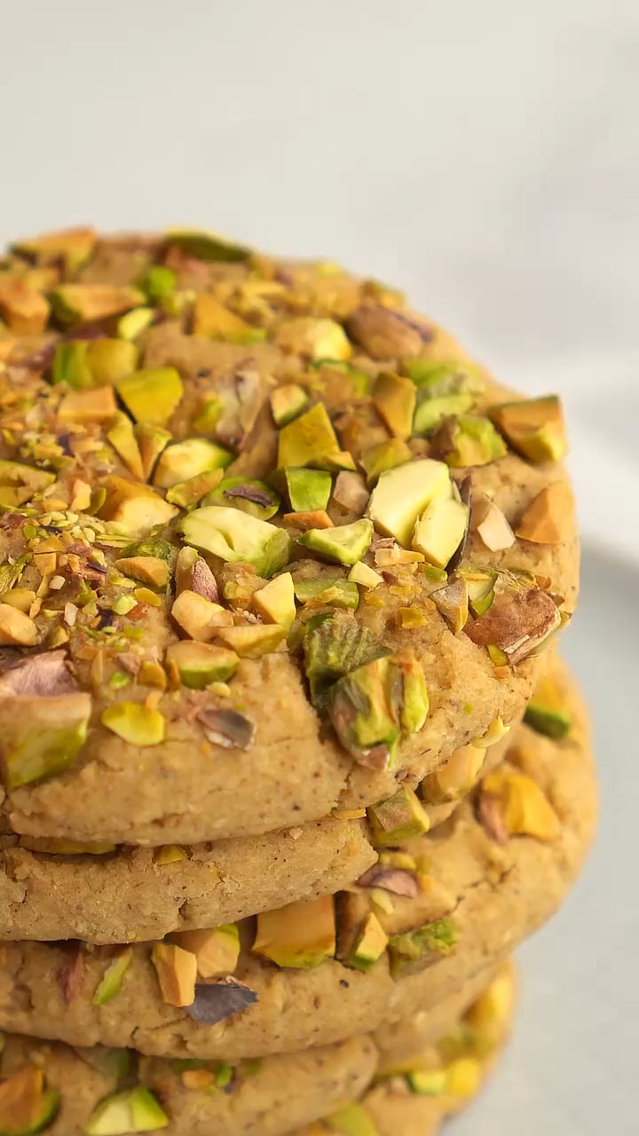 For each cookie, roll a small handful of dough into a ball and flatten it down onto the pistachios, pressing down to make them stick.