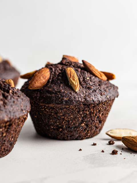 Pour the batter into a greased muffin tray and top with halved almonds.