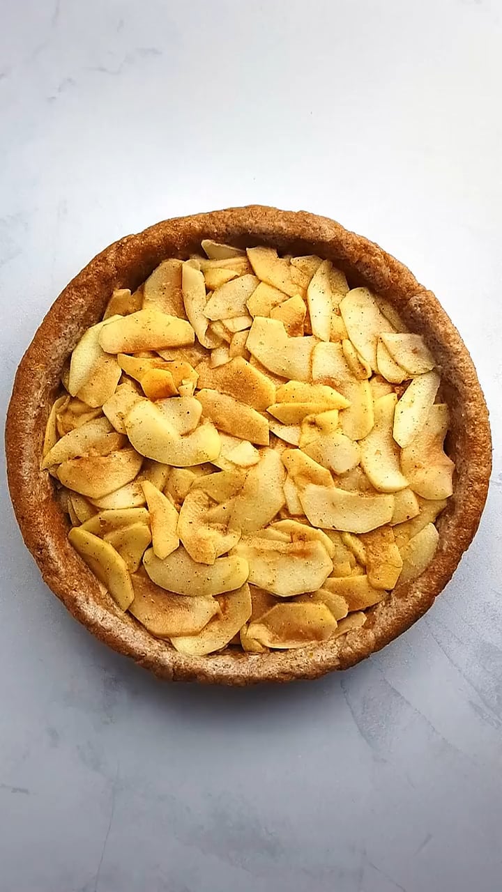 Pack the pie base with the apple filling making sure it reaches the dish edge.