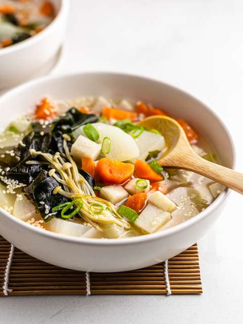 Now, add the wakame and spring onions to the soup, cook for 3 more minutes, and then remove from the heat.
